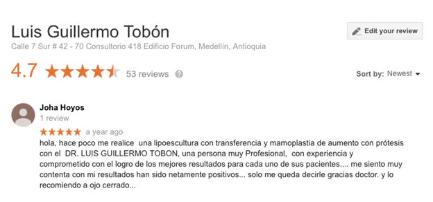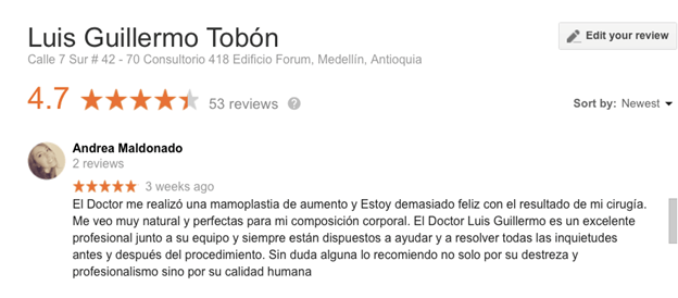 Paciente real operada por el Dr. Luis Guillermo Tobón. Procedimiento: Mamoplastia de aumento.